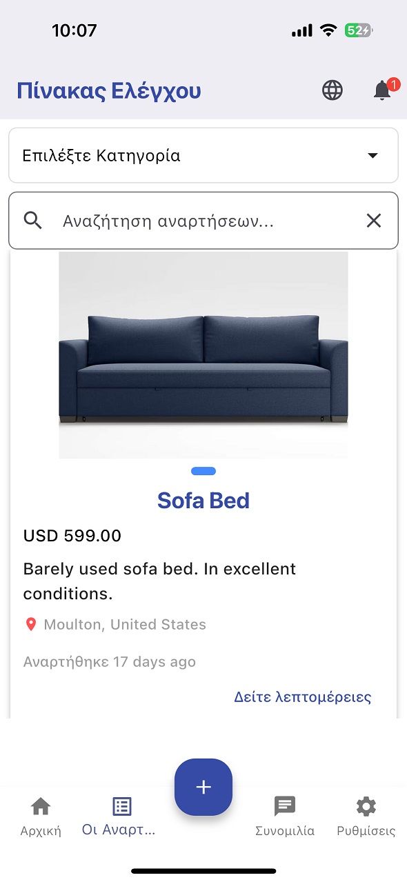 Ενδιαφέρεστε για μια ανάρτηση; Χρησιμοποιήστε την συνομιλία εντός εφαρμογής για να στείλετε μήνυμα απευθείας στον πωλητή. Συζητήστε το προϊόν, ζητήστε περισσότερες λεπτομέρειες ή φωτογραφίες και διαπραγματευτείτε — όλα μέσα στην εφαρμογή. Μείνετε συνδεδεμένοι και ενημερωμένοι σε κάθε βήμα.